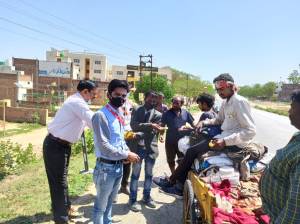 जिससे प्रदेशों में फंसे मजदूरी पेशा करने वाले अपने घरों को जा रहे राहगीरों को रोककर काशीराम कॉलोनी के पास शिक्षामित्र संगठन एवं पत्रकार समाज व रामकोट थाना प्रभारी निरीक्षक ओपी राय के द्वारा लंच पैकेट व फल वितरण किया गया।
