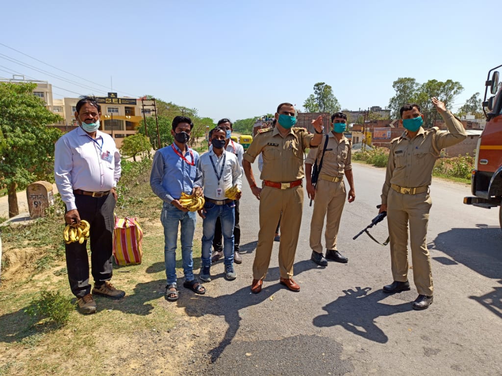 शिक्षामित्र संगठन एवं पत्रकार समाज व पुलिस प्रशासन के द्वारा वितरण किया गया फल व भोजन
