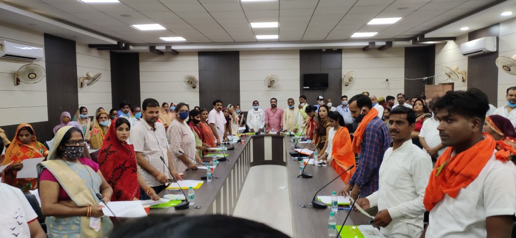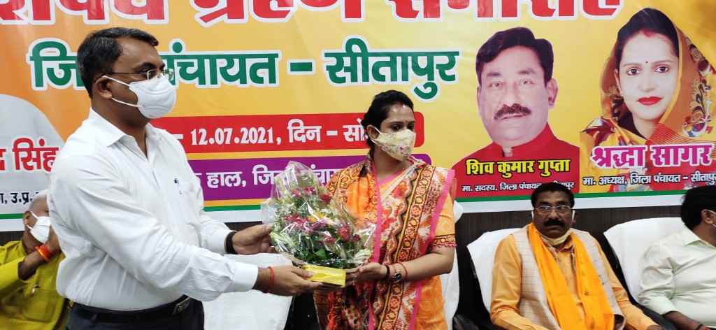 सीतापुर: जिला पंचायत कार्यालय के नेहरू हाल सभागार में सोमवार को आयोजित नवनिर्वाचित जिला पंचायत अध्यक्ष व जिला पंचायत सदस्यों के शपथ ग्रहण समारोह में जिलाधिकारी विशाल भारद्वाज ने नवनिर्वाचित जिला पंचायत अध्यक्ष श्रीमती श्रद्धा सागर को पद एवं गोपनियता की शपथ दिलायी। इसके बाद जिला पंचायत अध्यक्ष श्रद्धा सागर द्वारा समस्त नवनिर्वाचित 77 जिला पंचायत सदस्यों को शपथ ग्रहण कराया गया।
