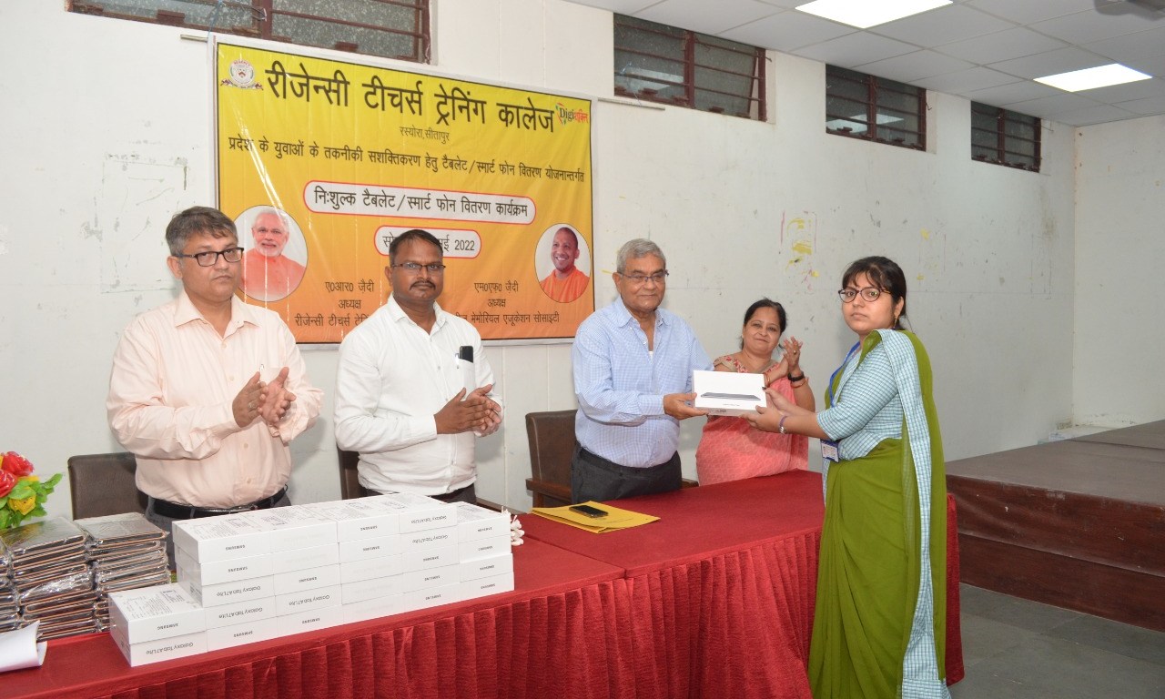 टेबलेट वितरण कार्यक्रम का आयोजन रीजेंसी टीचर्स ट्रेनिंग कॉलेज के प्रांगण में हुआ। यहां कालेज के संस्थापक अध्यक्ष एम. एफ. जैदी ने अपने हाथों से टैबलेट देकर कार्यक्रम का शुभारंभ किया।