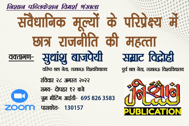 सीतापुर- निशान पब्लिकेशन द्वारा आयोजित विमर्श श्रंखला कार्यक्रम के तहत ‘संवैधानिक मूल्यों के परिप्रेक्ष्य में छात्र राजनीति की भूमिका’ विषय पर वक्ताओं ने अपने विचार रखे| लखनऊ विश्वविद्यालय के वरिष्ठ छात्र नेता सुधांशु बाजपेयी ने कार्यक्रम को संबोधित करते हुए छात्र राजनीति की महत्ता और उसकी चुनौतियों पर प्रकाश डाला|