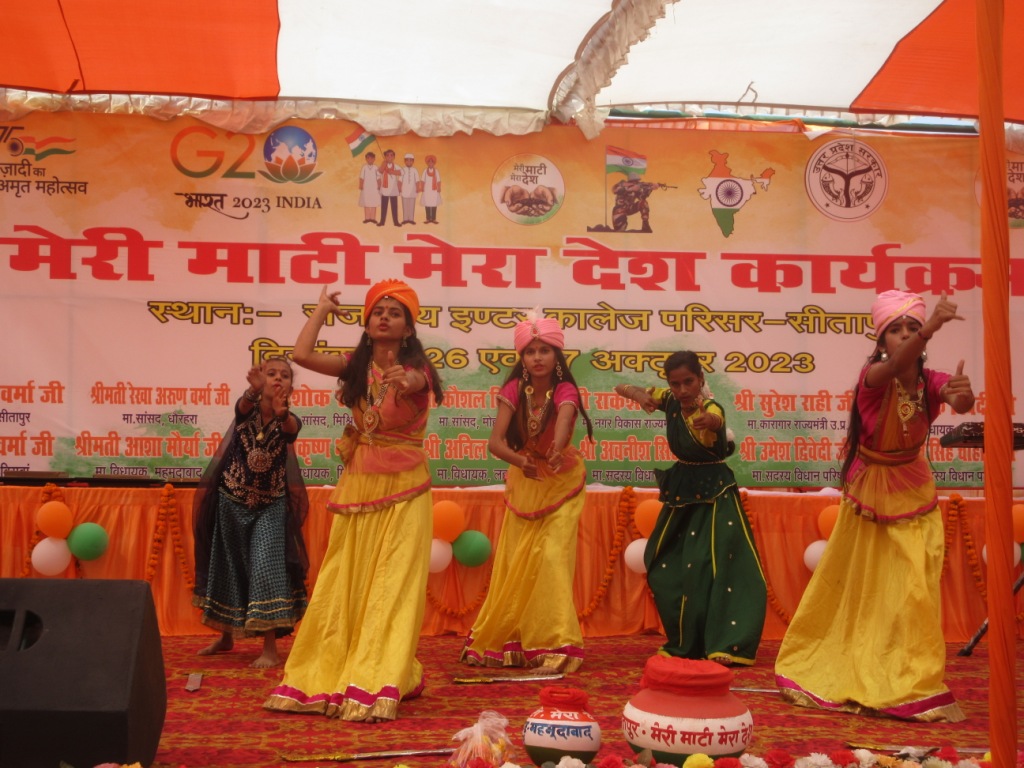 सीतापुर: आजादी का अमृत महोत्सव के अन्तर्गत मेरी माटी मेरा देश कार्यक्रम का भव्य आयोजन राजकीय इण्टर कालेज के परिसर में किया गया। कार्यक्रम के दौरान विभिन्न विद्यालयों जैसे हिन्दू कन्या पाठशाला, प्राथमिक विद्यालय मिश्रापुर, राजकीय इण्टर कालेज, राजकीय बालिका इण्टर कालेज, आर्य कन्या इण्टर कालेज, कम्पोजिट विद्यालय भगौतीपुर आदि के छात्र-छात्राओं द्वारा सांस्कृतिक कार्यक्रम का मनमोहक प्रस्तुतीकरण किया गया।