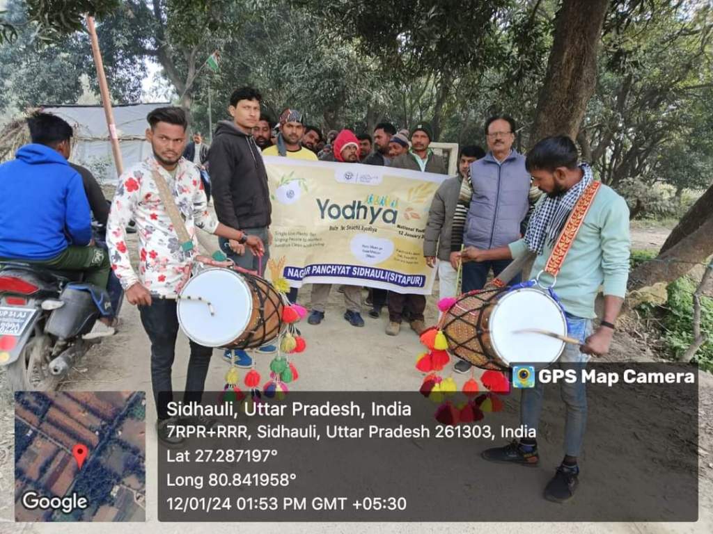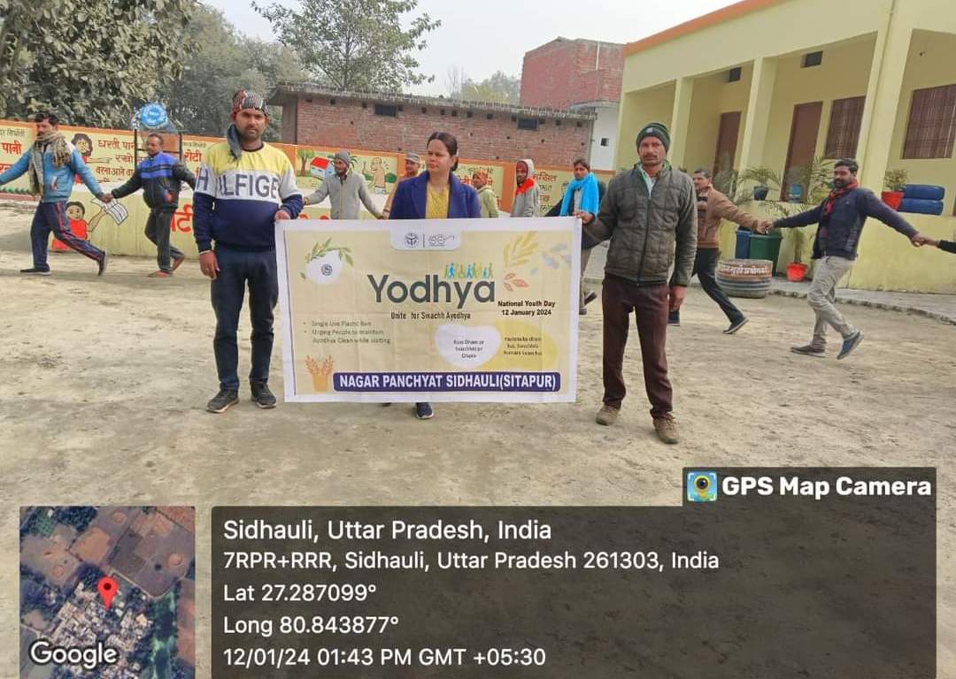 सीतापुर – आज इंटरनेशनल यूथ डे के अवसर पर नगर पंचायत सिधौली द्वारा “Yodhya- यूनाइट फॉर स्वच्छ अयोध्या अभियान के अंतर्गत वार्ड बहादुरपुर स्थित कबाड़ से जुगाड़ पार्क में नगर पंचायत के स्वच्छता कर्मियों एवं वार्ड संख्या एक के बच्चों द्वारा मानव श्रृंखला बनाते हुए रैली निकाली गई। और लोगों को स्वच्छता तथा पॉलिथीन का उपयोग न करने के लिए जागरूक किया गया ।