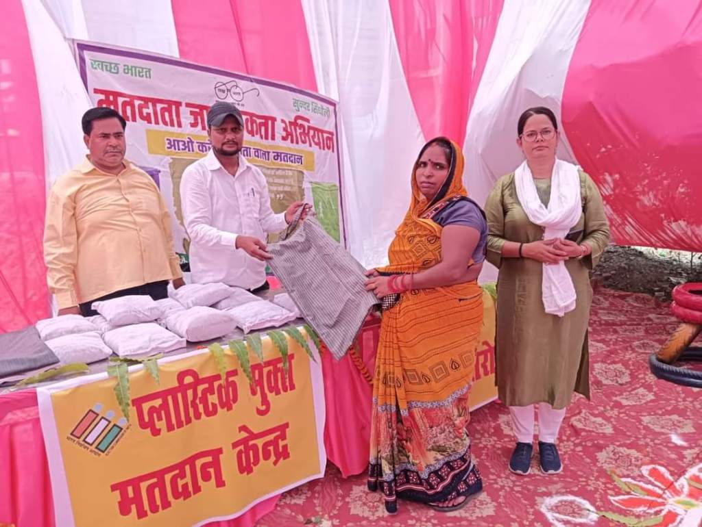 मतदान बूथ पर बाटें गये कपड़े के झोले व गीले कूड़े से निर्मित खाद