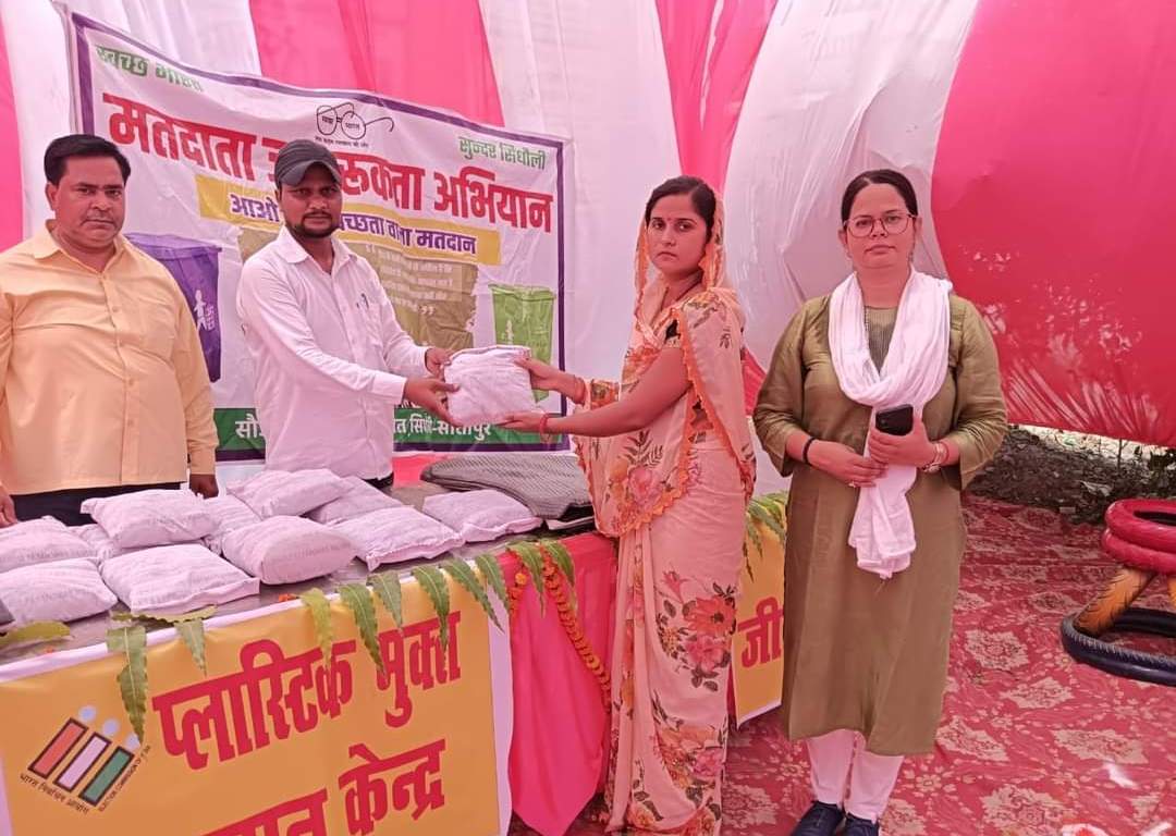 सीतापुर(सिधौली): प्लास्टिक मुक्त अभियान के अन्तर्गत आज नगर पंचायत सिधौली द्वारा बहादुरपुर स्थित गांधीनगर मतदान बूथ पर मतदाताओं को कपड़े के झोले एवं निकाय के कम्पोस्टिंग पिट सेंटर में गीले कूड़े से निर्मित खाद निःशुल्क वितरित की गई।
