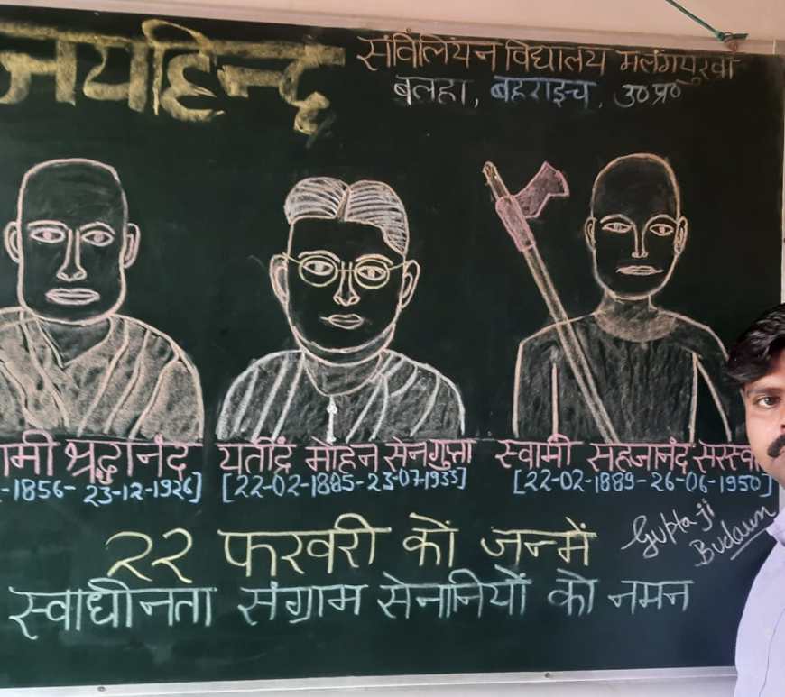 बहराइच: अरुण कुमार पुत्र श्री प्रेमशंकर गुप्ता, निवासी नगर उझानी, जिला बदायूँ के है, जो संविलियन विद्यालय मलंगपुरवा, बलहा बहराइच में कार्यरत है। शिक्षक के रूप में शिक्षण कार्य के साथ साथ शासन की मंशानुरूप चौरी-चौरा शताब्दी महोत्सव के प्रारंभ से प्रतिदिन अनवरत रूप से महापुरुषों के सम्बंध में चित्रण के माध्यम से बच्चों तथा समाज में सोशल मीडिया के माध्यम से ज्ञानवर्धक जानकारी दे … Continue reading चित्रण के माध्यम से महापुरुषों को नमन करते बेसिक के शिक्षक अरूण कुमार गुप्ता